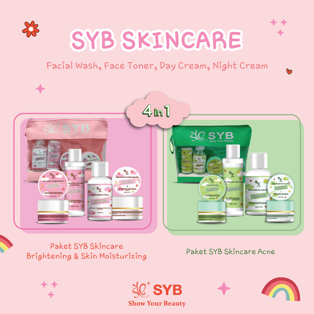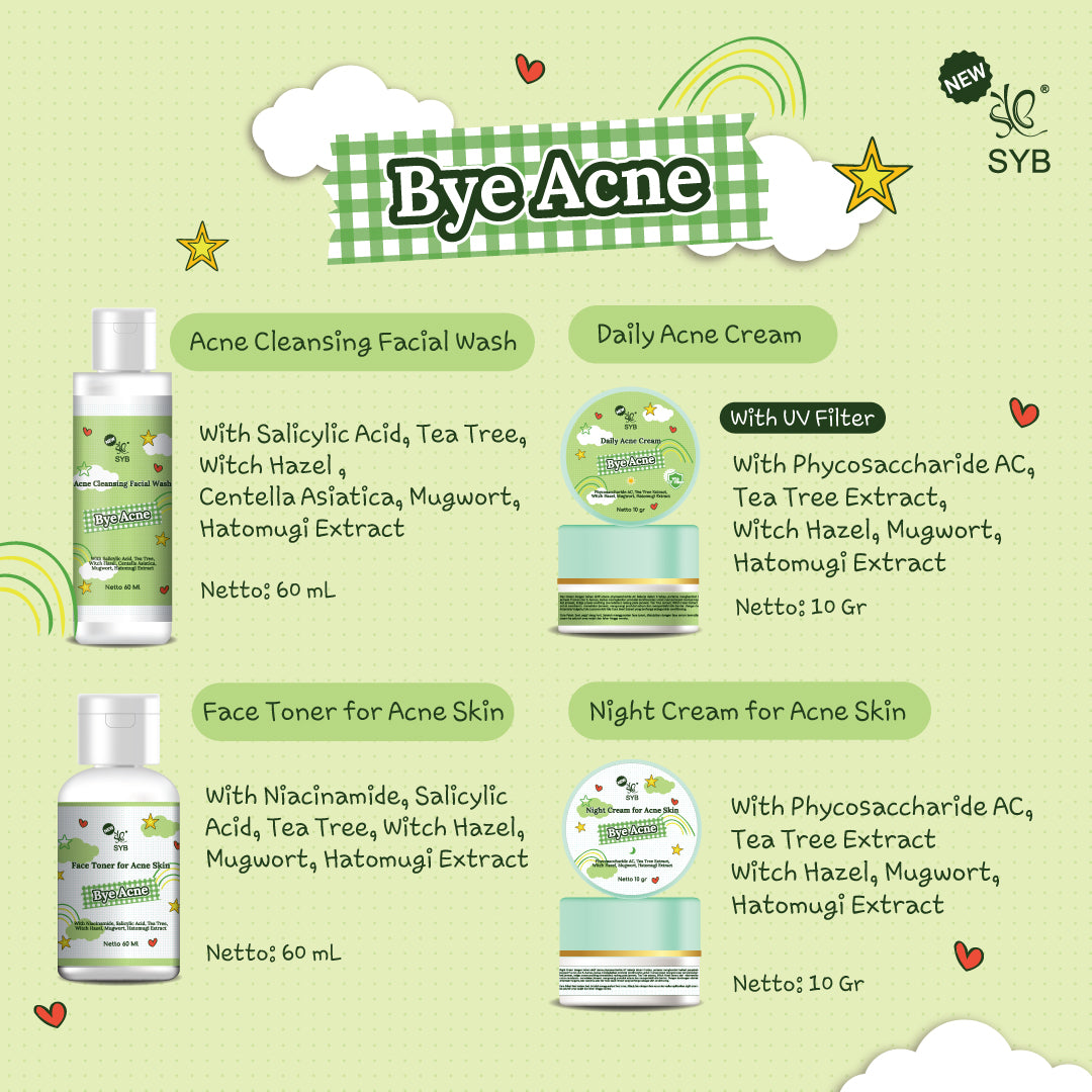 Paket SYB Bye Acne (4 In 1) adalah paket lengkap yang terdiri dari Day Cream, Night Cream, Facial Wash, dan Face Toner. Rangkaian perawatan wajah dengan kandungan bahan Aktif Phycosaccharide AC, Tea Tree extract, Witch Hazel Extract dan Niacinamide, Salicylic Acid, Ekstrak Artemisia Vulgaris, Coix Lacryma-Jobi Ma Yuen Seed Extract ini diformulasikan khusus untuk kulit berjerawat dan cenderung berjerawat.
