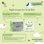 Night Cream dengan bahan aktif utama phycosaccharide AC bekerja dalam 3 tahap, pertama menghambat bakteri penyebab jerawat P.acnes dan S. Aureus, kedua meningkatkan produksi keratinocytes untuk mempercepat mempercepat penyembuhan lesi jerawat, ketiga proses soothing (meredakan) radang pada jerawat. Tea Tree extract, Witch Hazel Extract dan niacinamide untuk membantu meredakan jerawat, mengurangi produksi sebum dan memperbaiki skin barrier. Dengan kandungan ekstrak Artemisia Vulgaris,Coix Lacryma-Jobi Ma Yuen Seed Extract yang berfungsi sebagai skin conditioning.