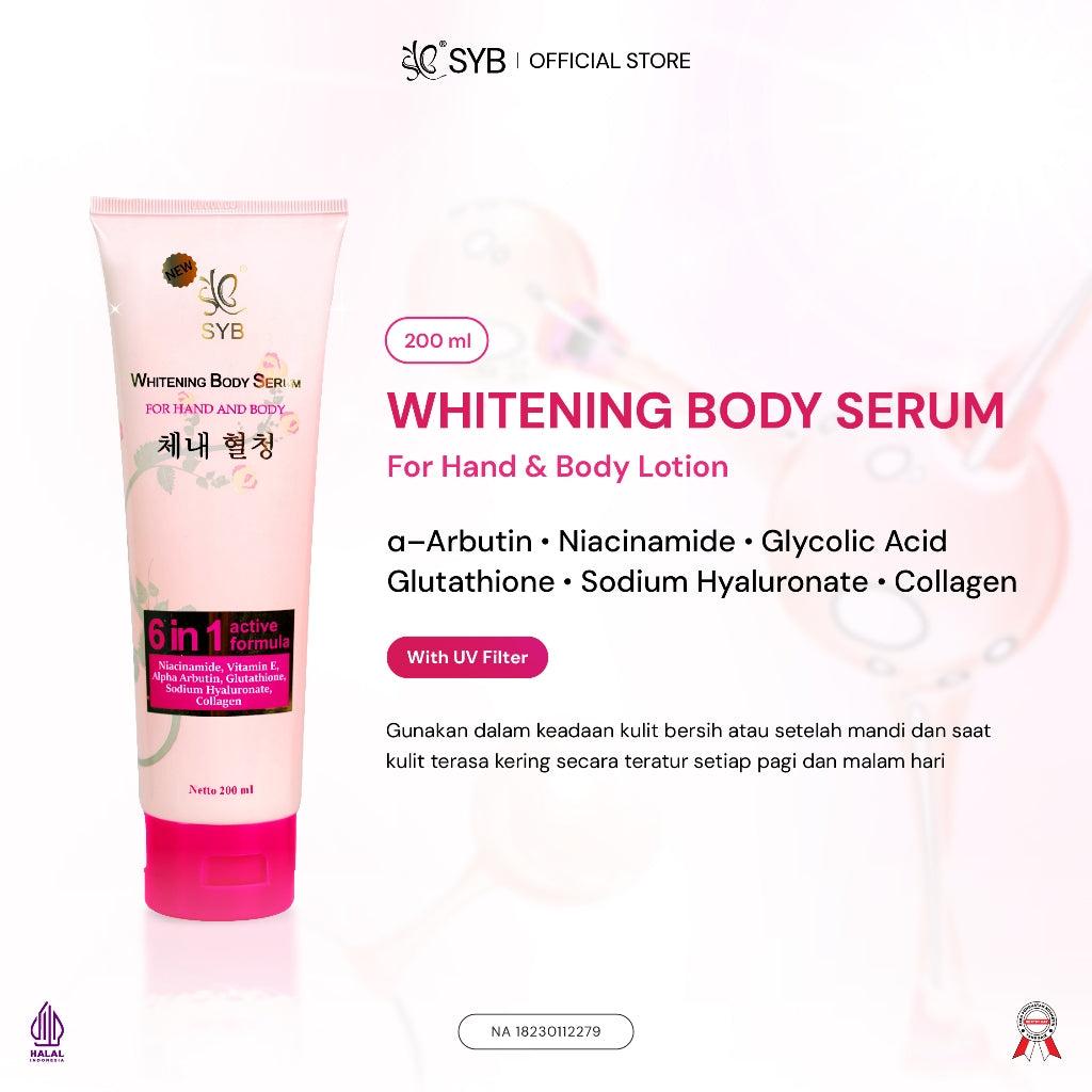 Lotion dengan serum yang diformulasikan dengan kandungan bahan aktif Niacinamide, Alpha Arbutin, Glutathione, Sodium Hyaluronate, Vitamin E dan Collagen untuk menutrisi serta merawat kulit sehingga kulit tampak lebih cerah dan lembab. Pemakaian NEW SYB WHITENING BODY SERUM WITH COLLAGEN dapat terlihat dengan pemakaian rutin. Kulit akan tampak lebih cerah dan hasilnya permanen apabila dipakai secara rutin setiap hari.