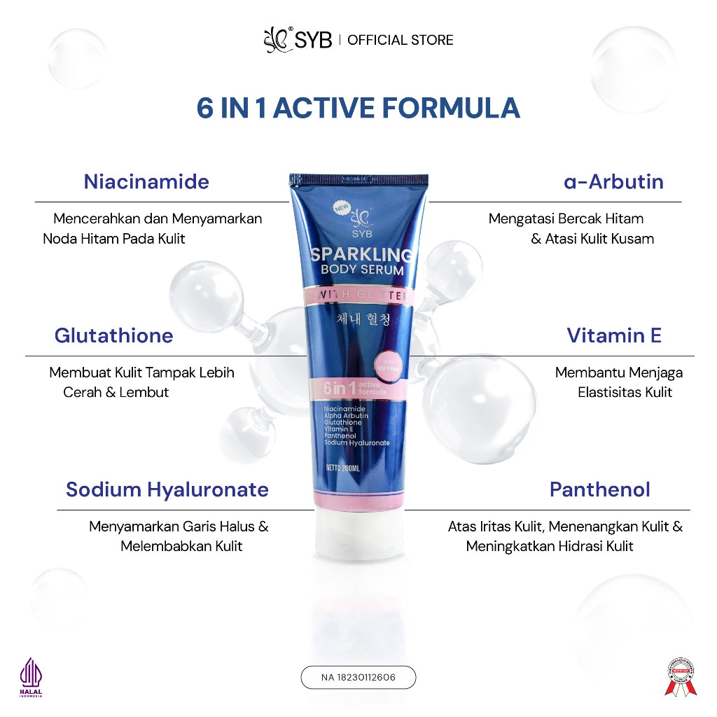 Lotion dengan kandungan serum yang diformulasikan khusus dengan variasi bahan aktif niacinamide, alpha arbutin, glutathione, sodium hyaluronate, vitamin E, dan panthenol untuk merawat kulit sehingga kulit tampak lebih cerah dan lembab. Dengan butiran glitter membuat kulit tampak glowing dan bersinar