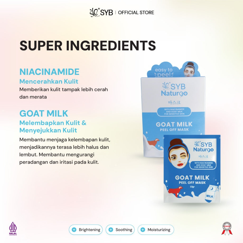 SYB NATUR90 GOAT MILK PEEL OFF MASK diformulasikan dengan kandungan Niacinamide dan Goat Milk untuk membantu kulit tampak lebih cerah, memberikan kelembapan pada kulit, plus skin soothing untuk memberikan perlindungan pada kulit sensitif. SYB NATUR90 GOAT MILK PEEL OFF MASK cocok untuk kulit sensitif dan dapat membersihkan pori-pori wajah dari kotoran serta minyak berlebih. Pemakaian secara teratur akan membantu kulit wajah lebih bersih, halus dan cerah.