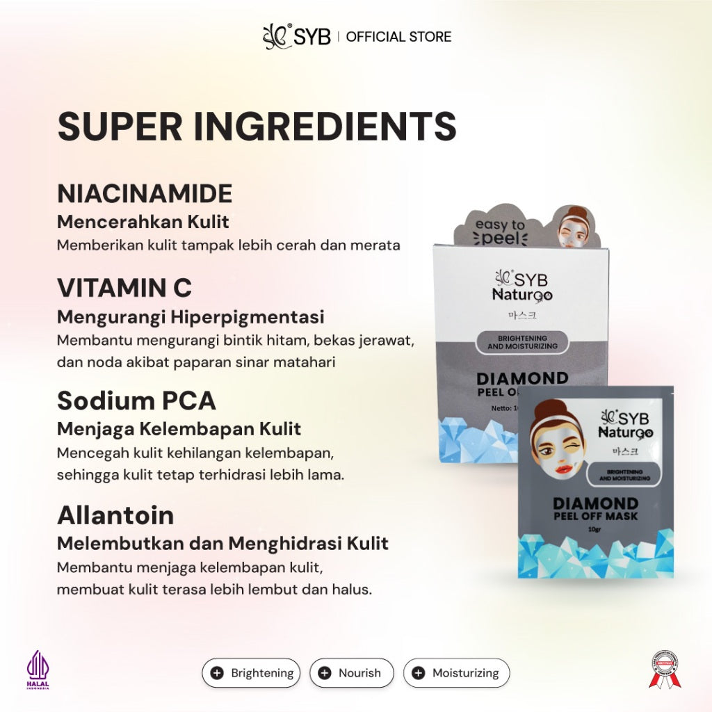 SYB NATUR90 DIAMOND PEEL OFF MASK diformulasikan dengan Niacinamide, Vitamin C, Sodium PCA dan Allantoin untuk membantu mencerahkan, menutrisi dan memberikan kelembapan pada kulit. SYB NATUR90 DIAMOND PEEL OFF MASK dapat membersihkan pori-pori wajah dari kotoran dan minyak berlebih. Pemakaian secara teratur akan membantu kulit wajah lebih bersih, halus dan cerah.