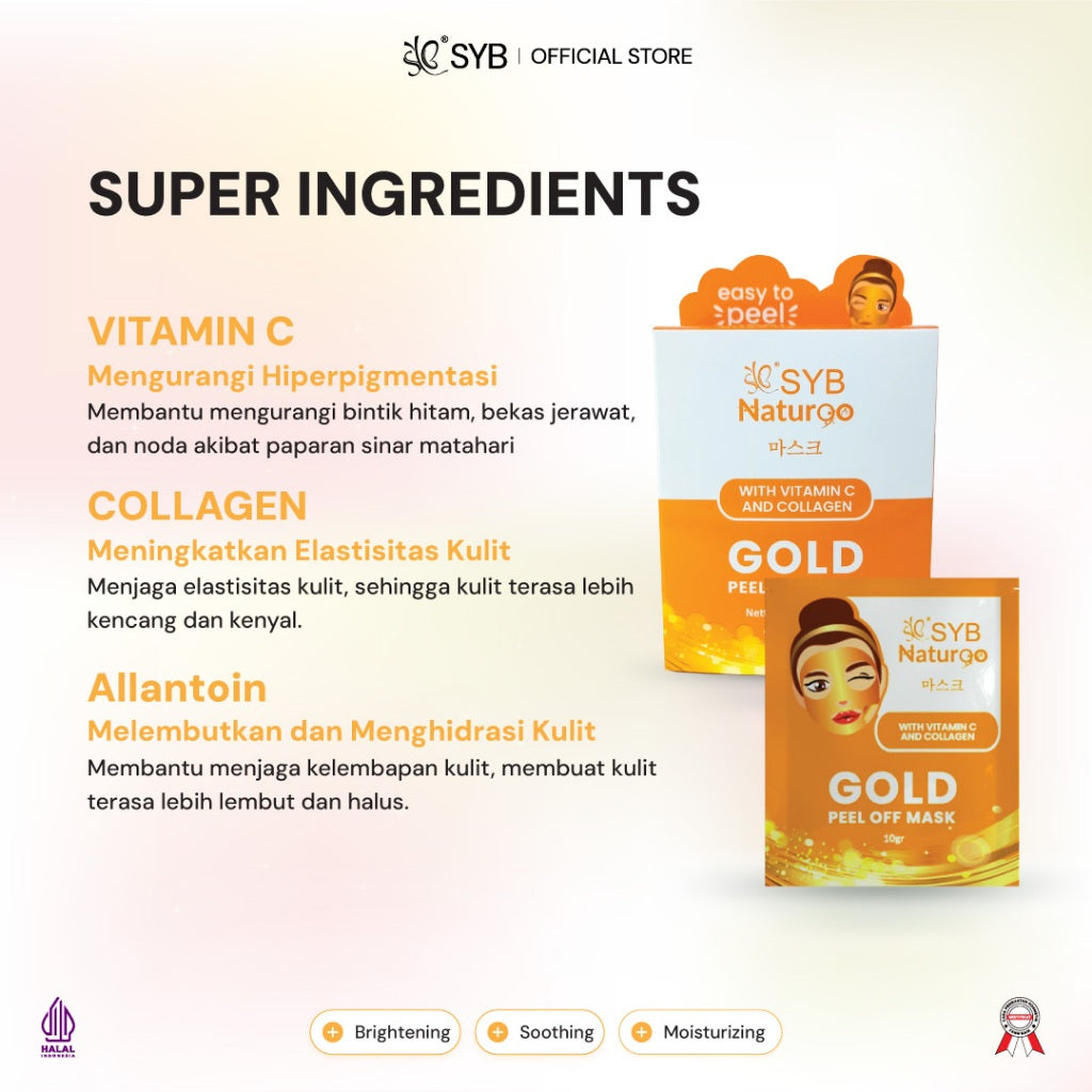 SYB NATUR90 GOLD PEEL OFF MASK diformulasikan dengan kandungan Vitamin C, Hydrolyzed Collagen dan Allantoin untuk membantu mencerahkan, menutrisi dan memberikan kelembapan pada kulit. SYB NATUR90 GOLD PEEL OFF MASK dapat membersihkan pori-pori wajah dari kotoran dan minyak berlebih serta menyegarkan kulit wajah. Pemakaian secara teratur akan membantu kulit wajah lebih bersih, halus dan cerah.