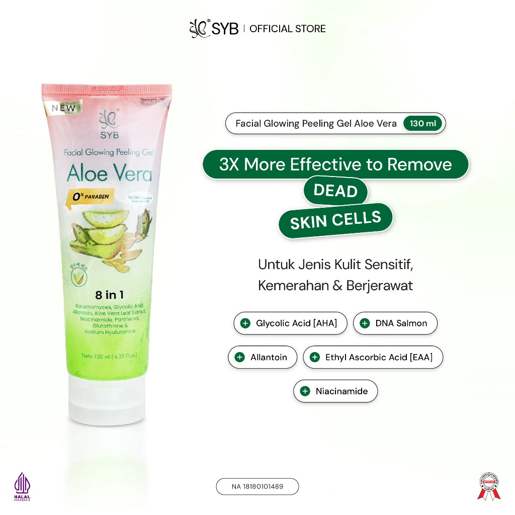 SYB FACIAL GLOWING PEELING GEL ALOE VERA cocok untuk kulit sensitif, berjerawat dan kemerahan.