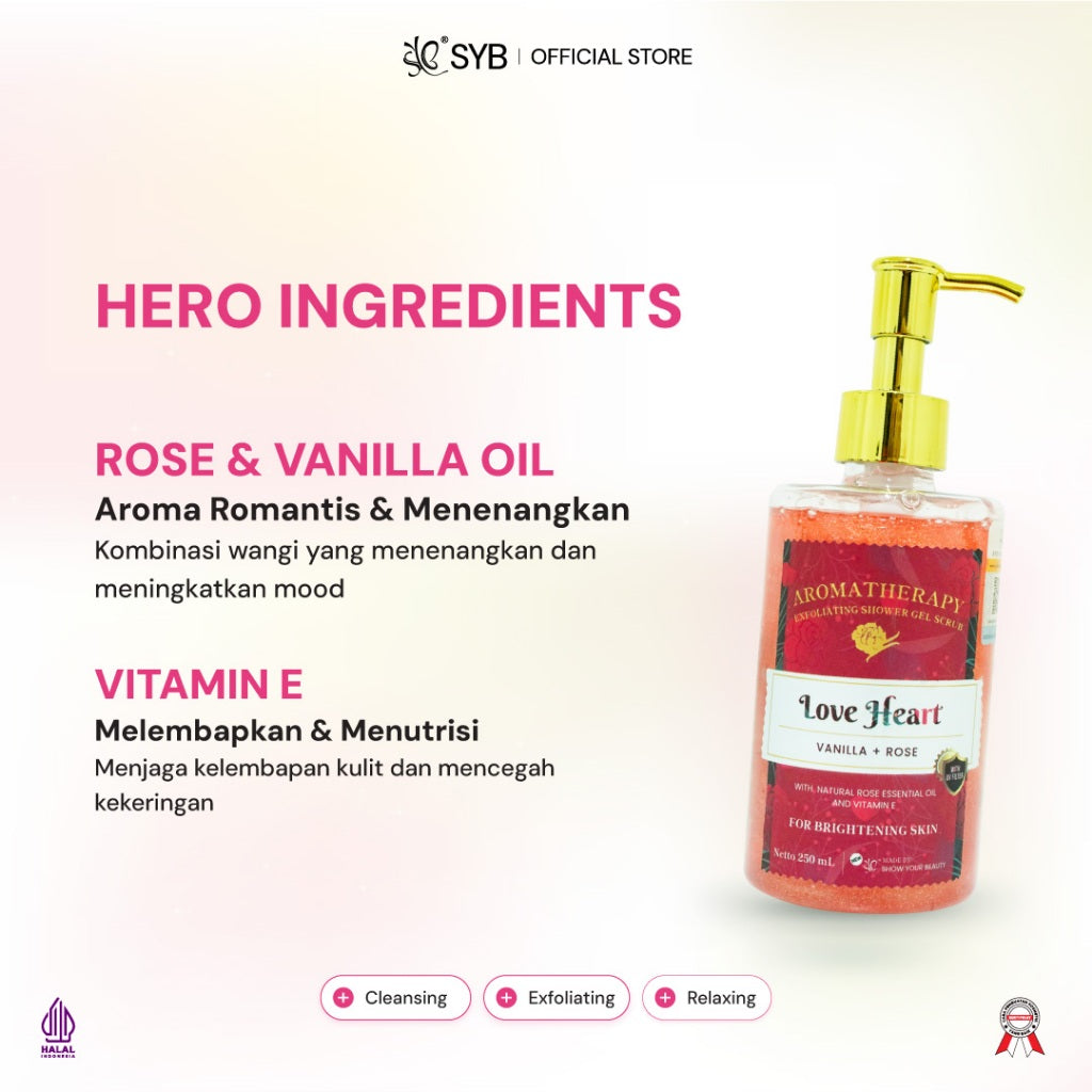 Aromatherapy Exfoliating Shower Gel Scrub varian LOVE HEART mengandung aroma Vanilla dan Rose. Wangi aromaterapinya membuat aktifitas mandi menjadi menyenangkan dan relax serasa spa dirumah.