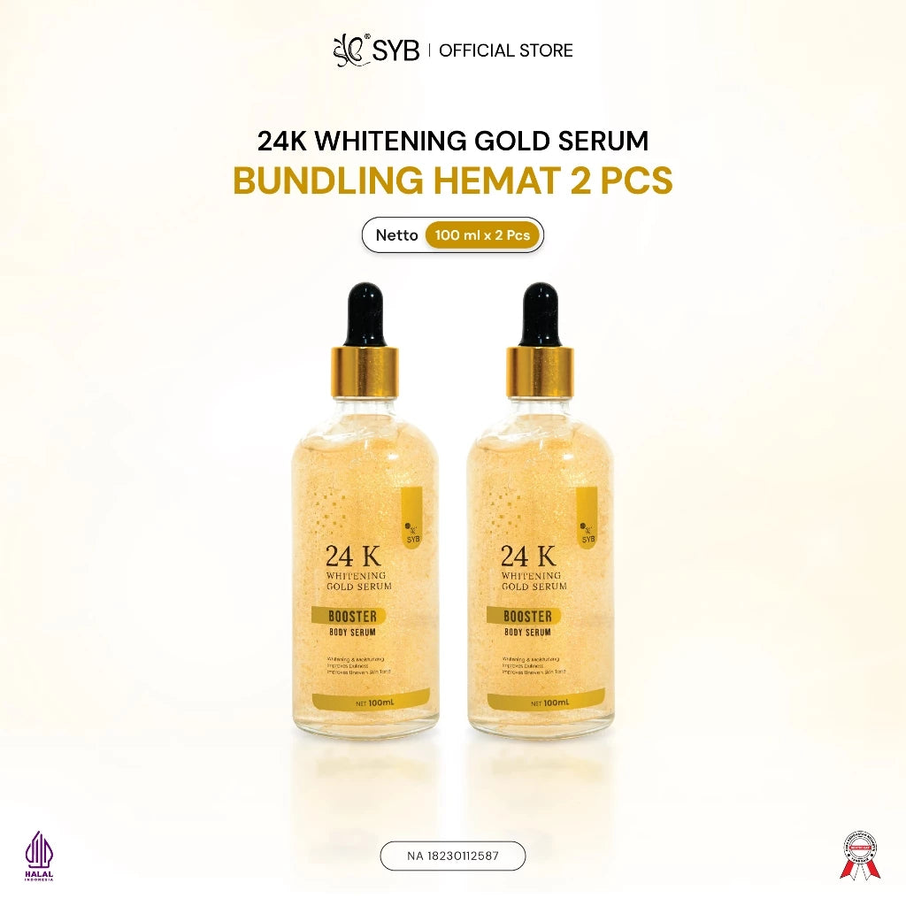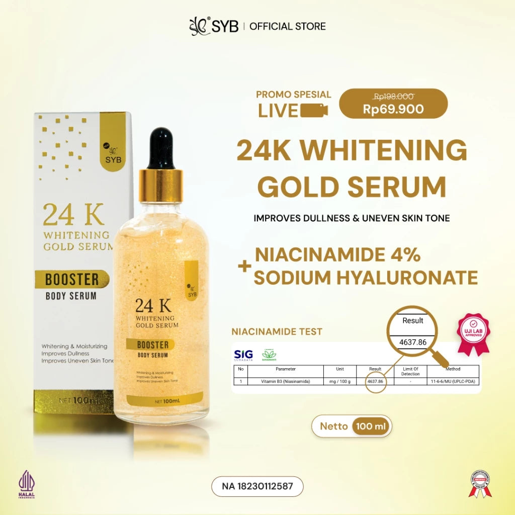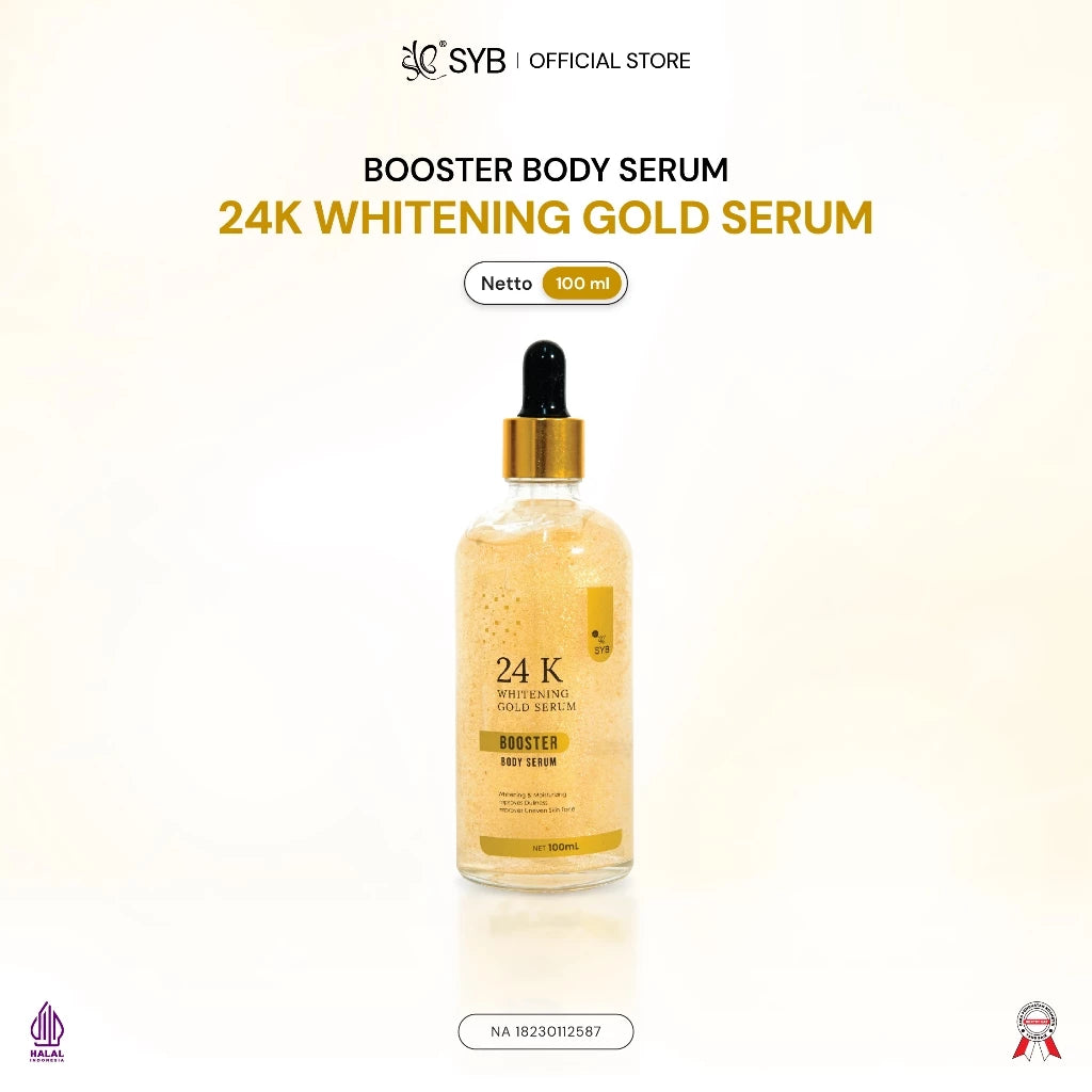 Serum badan dengan kandungan whitening agent dan mengandung gold 24K, dan sodium hyaluronate, dapat membantu membuat kulit tampak lebih cerah dan meratakan warna kulit.