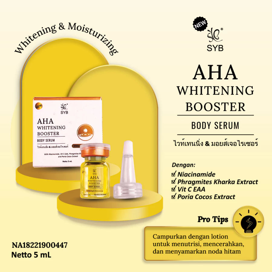 Serum badan yang menutrisi, melembapkan, mencerahkan dan menyamarkan noda hitam di kulit. SYB AHA WHITENING BOOSTER BODY SERUM diformulasikan dengan bahan aktif Cobio AHA (glycolic acid, malic acid, tartaric acid), Niacinamide, Vit C EAA sebagai Whitening Agent, Phragmites Kharka Extract serta Poria Cocos Extract sebagai skin conditioning. Menjadikan kulit terasa halus, lembut dan lebih cerah.