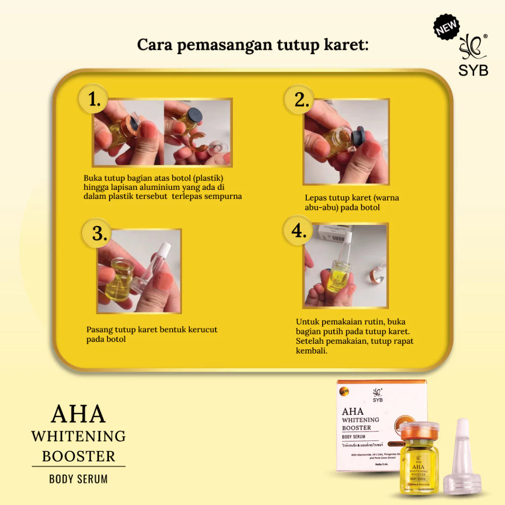 Campurkan 2-3 tetes SYB AHA WHITENING BOOSTER BODY SERUM dengan lotion, kemudian oleskan ke seluruh bagian tubuh. Atau campurkan seluruh isi SYB AHA WHITENING BOOSTER BODY SERUM dengan 1 botol lotion atau cream.