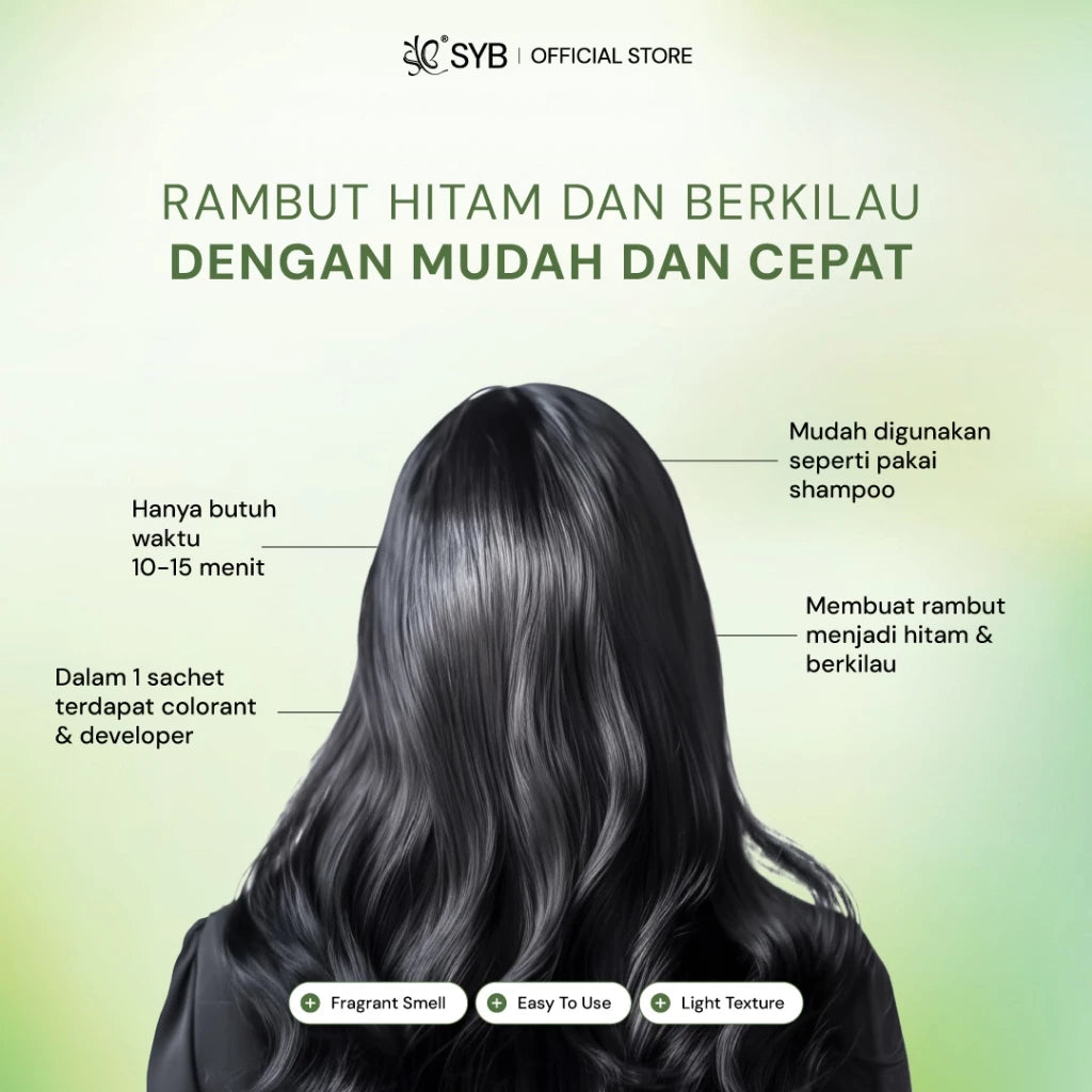 Dalam 1 sachet terbagi menjadi 2 bagian, yaitu SYB Olive Black Hair Magic (Colorant) dan SYB Black Hair Magic (Developer) dengan netto masing-masing 10ml.