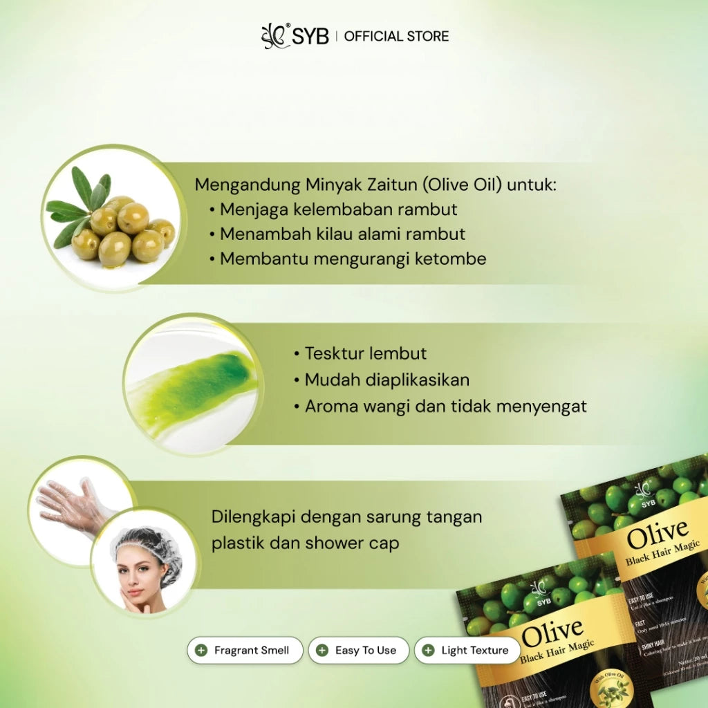 SYB OLIVE BLACK HAIR MAGIC with OLIVE OIL dapat membantu mengembalikan kehitaman rambut hanya dalam waktu 10-20 menit dan memberikan asupan nutrisi pada rambut sehingga tidak mudah pudar meski sering keramas.