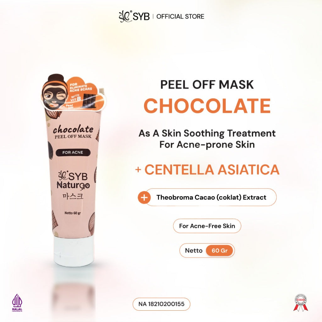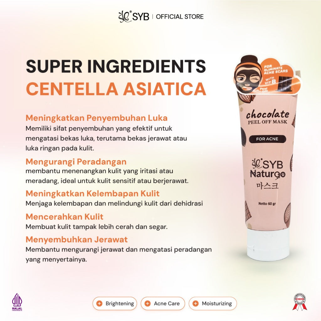 SYB NATUR90 CHOCOLATE PEEL OFF MASK diformulasikan dengan Ekstrak Theobroma Cacao (Coklat) dan Ekstrak Centella Asiatica yang berfungsi skin soothing pada kulit berjerawat. SYB NATUR90 CHOCOLATE PEEL OFF MASK dapat membantu membersihkan pori-pori wajah dari kotoran dan minyak berlebih, mengangkat komedo dan menyegarkan kulit wajah. Pemakaian secara teratur akan menjaga kulit wajah tetap bersih.