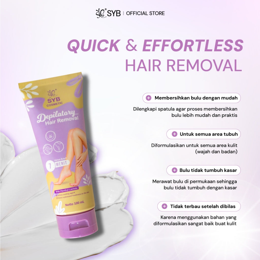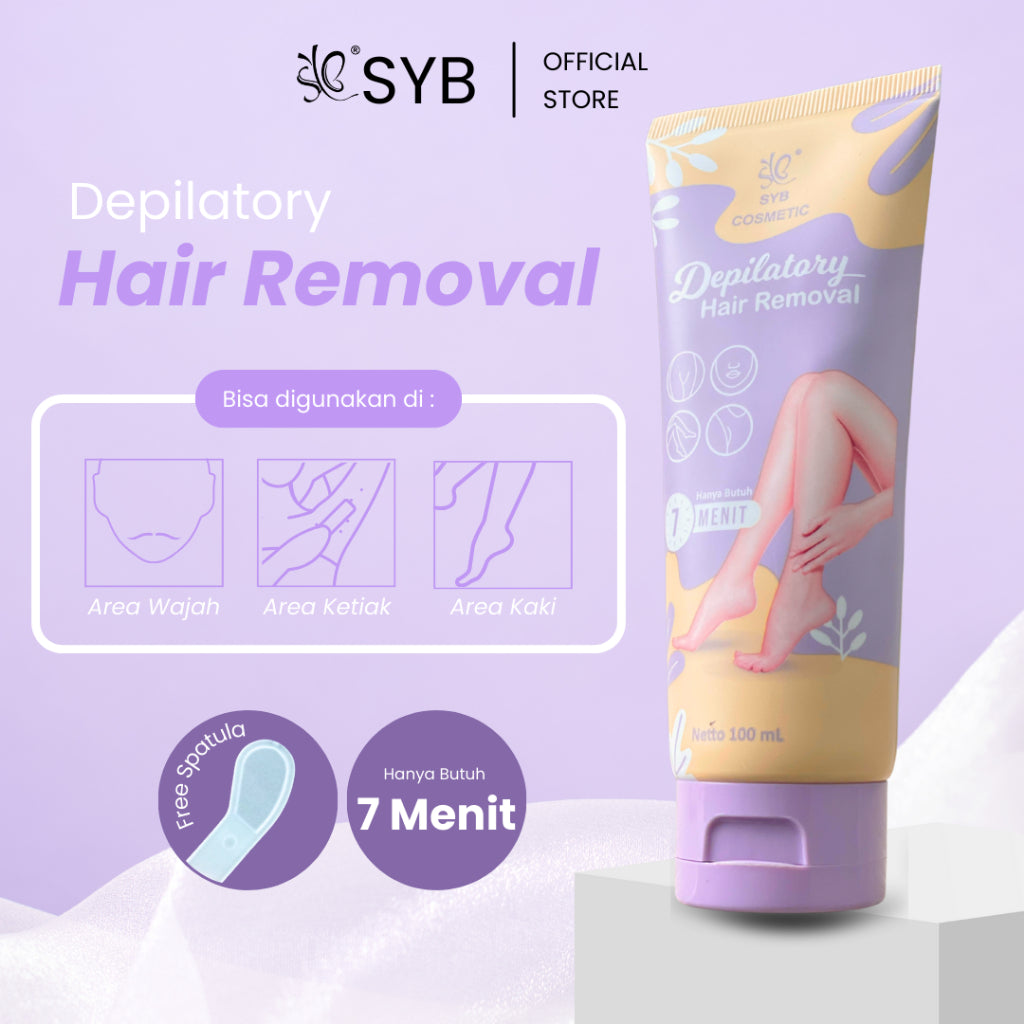 Krim perawatan tubuh yang berfungsi untuk membersihkan, membuka pori kulit dan menghilangkan rambut di permukaan kulit dalam waktu 7 menit. Selain digunakan untuk merontokkan rambut tangan dan kaki, SYB Cosmetic Depilatory Hair Removal Cream juga dapat digunakan pada ketiak, area wajah (kumis dan janggut) serta pada area sensitif.
