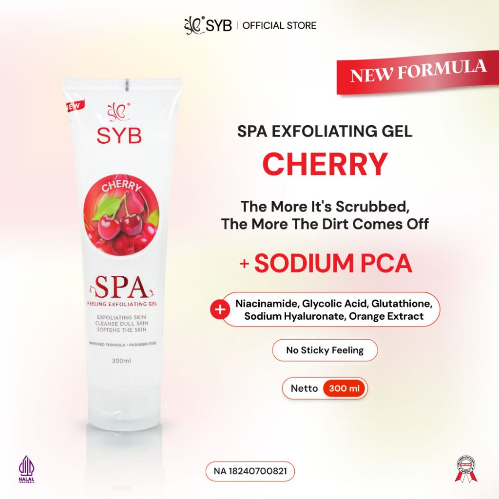 SYB SPA EXFOLIATING GEL sudah terdaftar Halal MUI, BPOM serta terdiri dari 13 varian diantaranya: Cherry, Charcoal, Blueberry, Aloe Vera, Lemon, Rose, Rainbow Fruitamin, Orange, Rice, Strawberry, Grape, Milk dan Chocolate.