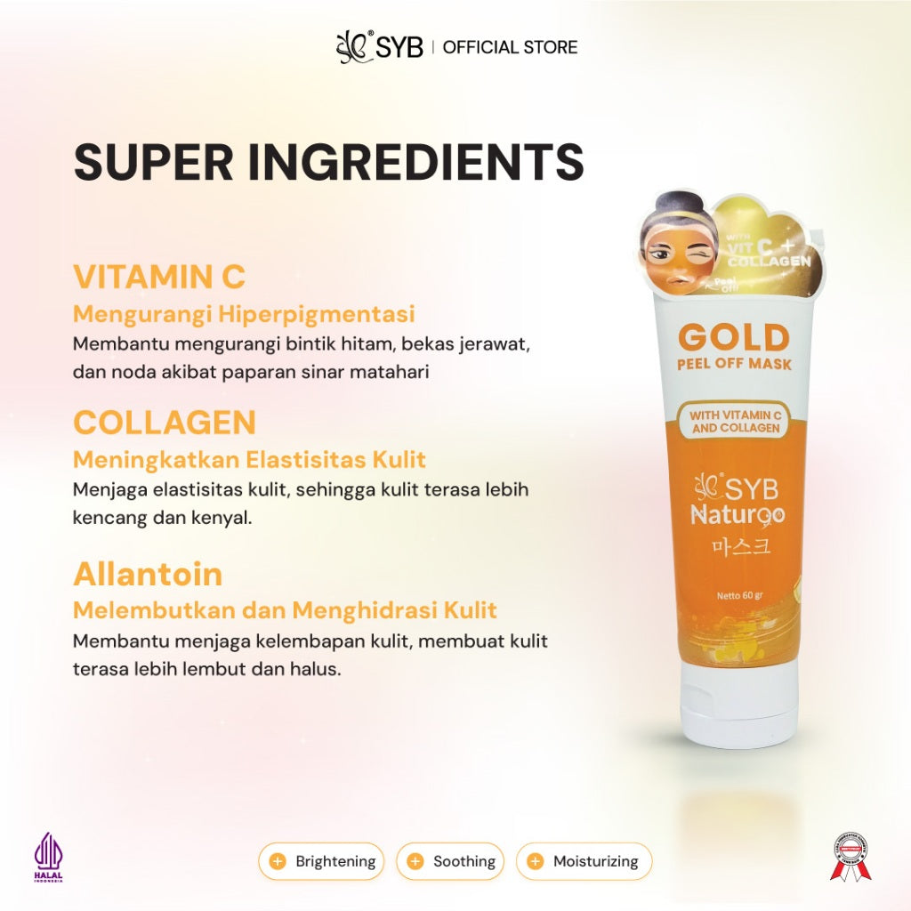SYB NATUR90 GOLD PEEL OFF MASK diformulasikan dengan kandungan Vitamin C, Hydrolyzed Collagen dan Allantoin untuk membantu mencerahkan, menutrisi dan memberikan kelembapan pada kulit. SYB NATUR90 GOLD PEEL OFF MASK dapat membersihkan pori-pori wajah dari kotoran dan minyak berlebih serta menyegarkan kulit wajah. Pemakaian secara teratur akan membantu kulit wajah lebih bersih, halus dan cerah.